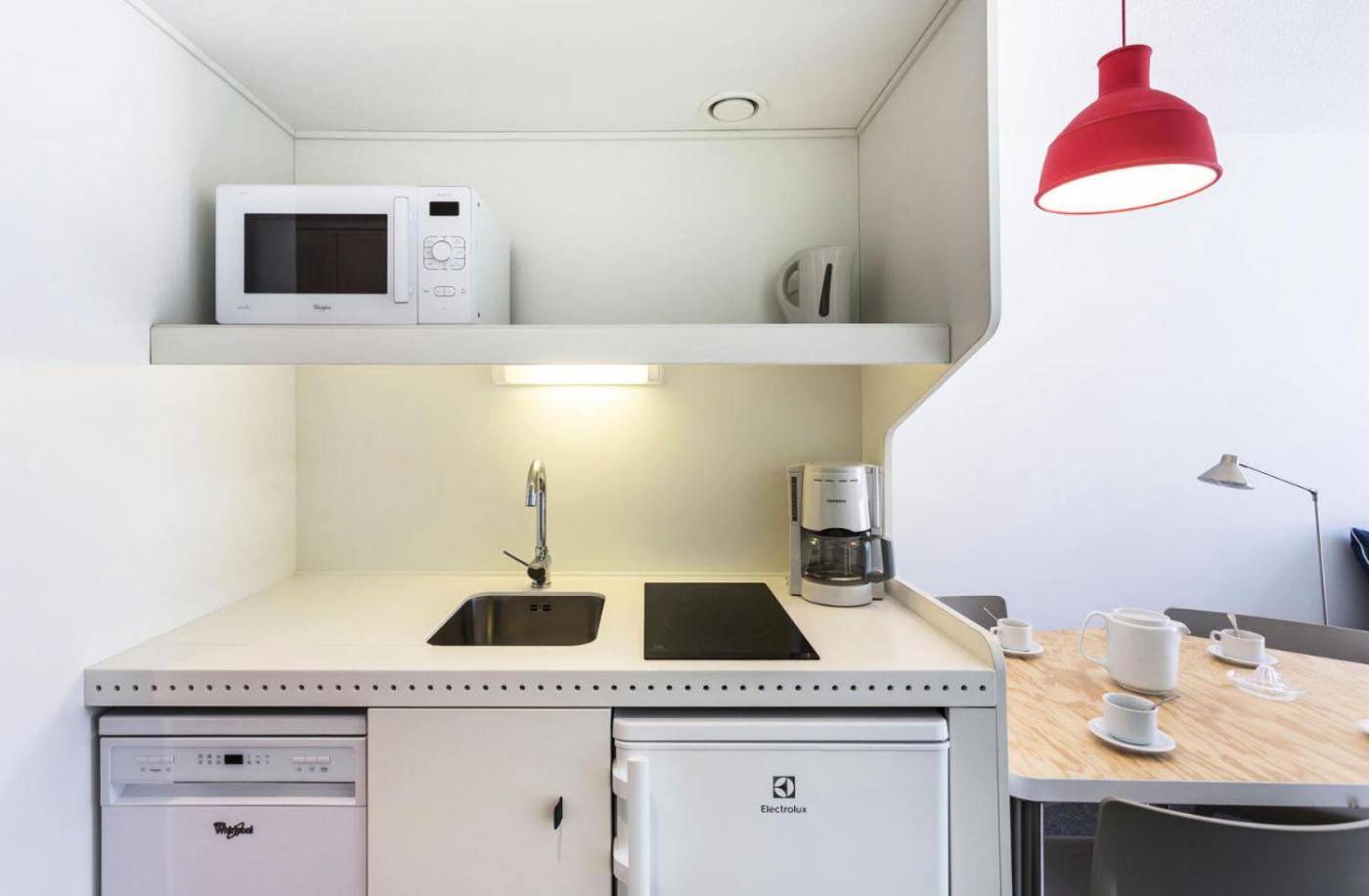 Studio. The studios kitchen, which features a refrigerator and a dishwasher, is available for cooking and storing food. This studio provides a TV.