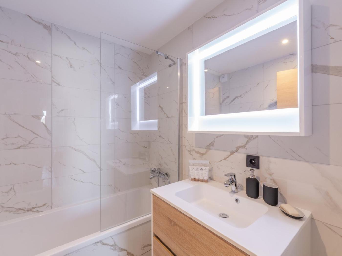 Cet appartement comporte 2 chambres, une cuisine avec un réfrigérateur et un lave-vaisselle, un lave-linge, ainsi que 2 salles de bains avec un sèche-cheveux. Une télévision est à disposition.
