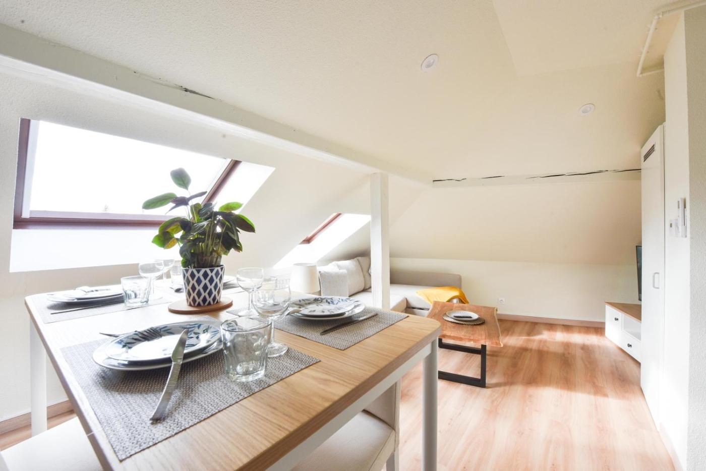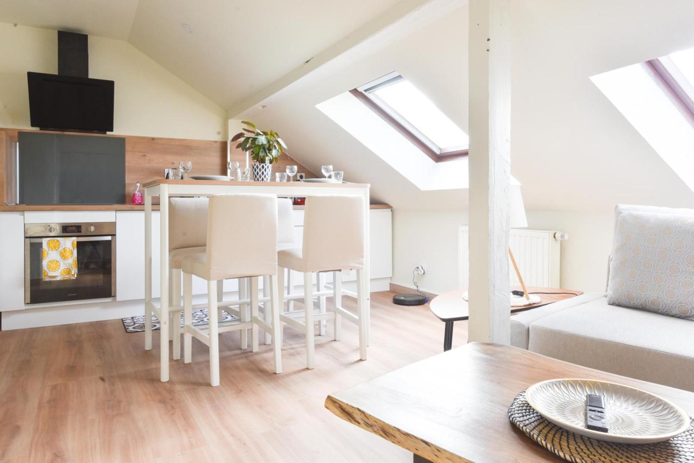 Appartement 1 Chambre. This air-conditioned apartment features 1 living room, 1 separate bedroom and 1 bathroom with a bath. Guests can make meals in the kitchen that has a stovetop, a refrigerator, kitchenware and an oven. The apartment has parquet floors, a seating area with a flat-screen TV with streaming services, a washing machine, soundproof walls, as well as a tea and coffee maker. The unit has 2 beds.