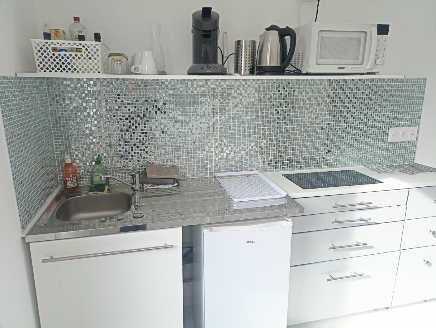 Studio avec Terrasse. Guests can make meals in the kitchen that features a refrigerator, kitchenware, a microwave and a tea and coffee maker. A seating area with a TV, a desk, a terrace and a private bathroom are available in this studio. The unit has 1 bed.