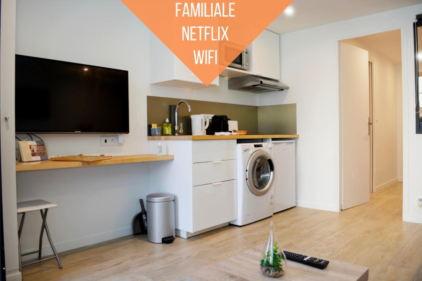 Appartement 1 Chambre. Boasting a private entrance, this apartment comes with 1 living room, 1 separate bedroom and 1 bathroom with a shower and a hairdryer. The fully equipped kitchen has a stovetop, a refrigerator, kitchenware and a microwave. The apartment features a flat-screen TV with streaming services, a washing machine, a coffee machine, a seating area as well as a quiet street view. The unit has 2 beds.